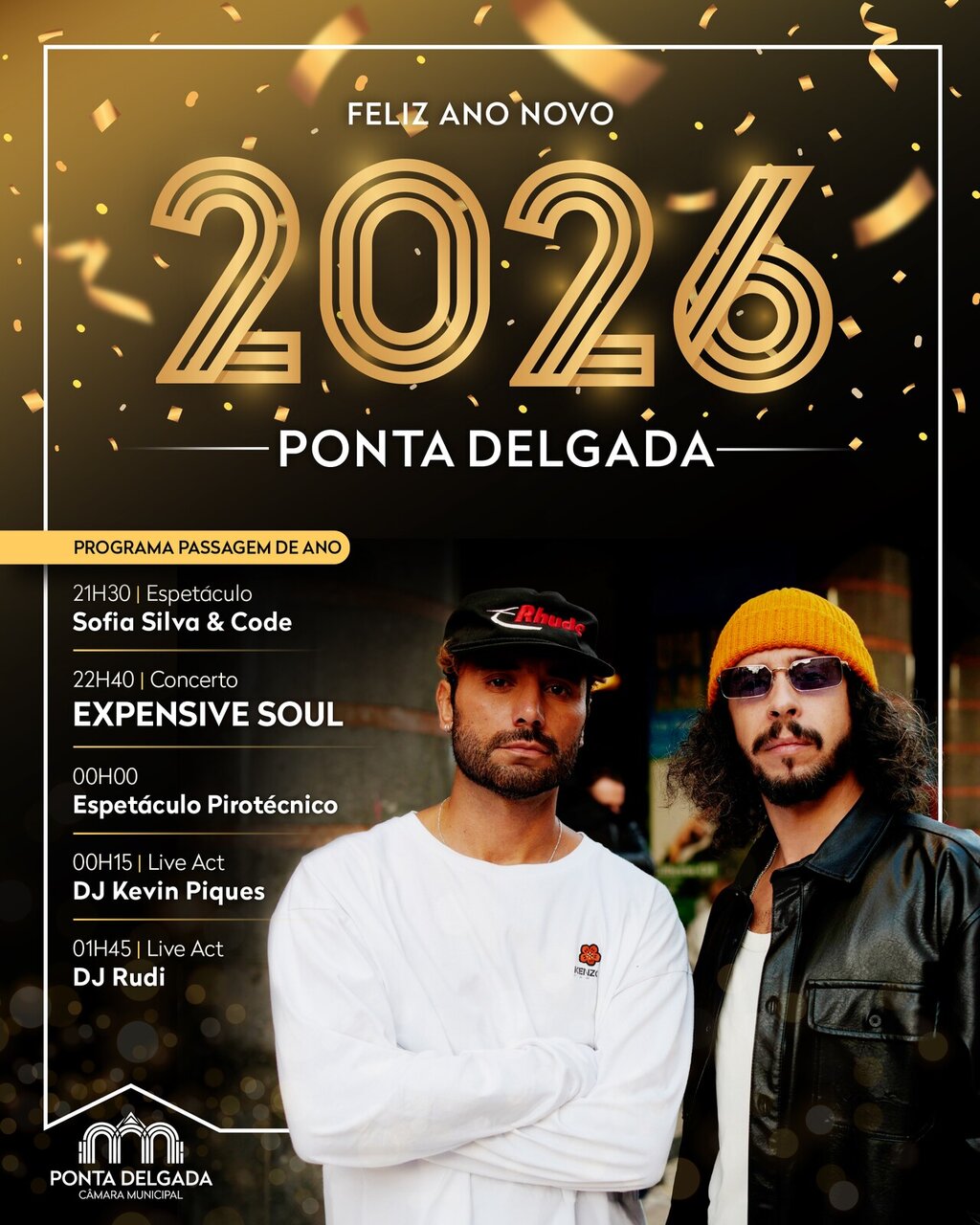 21h15 – Espetáculo Sofia Silva & Code | 22h30 – Concerto com a Banda Expensive Soul | 00h00 – Espetáculo Pirótecnico | 00h20 – Live Act – DJ Kevin Piques