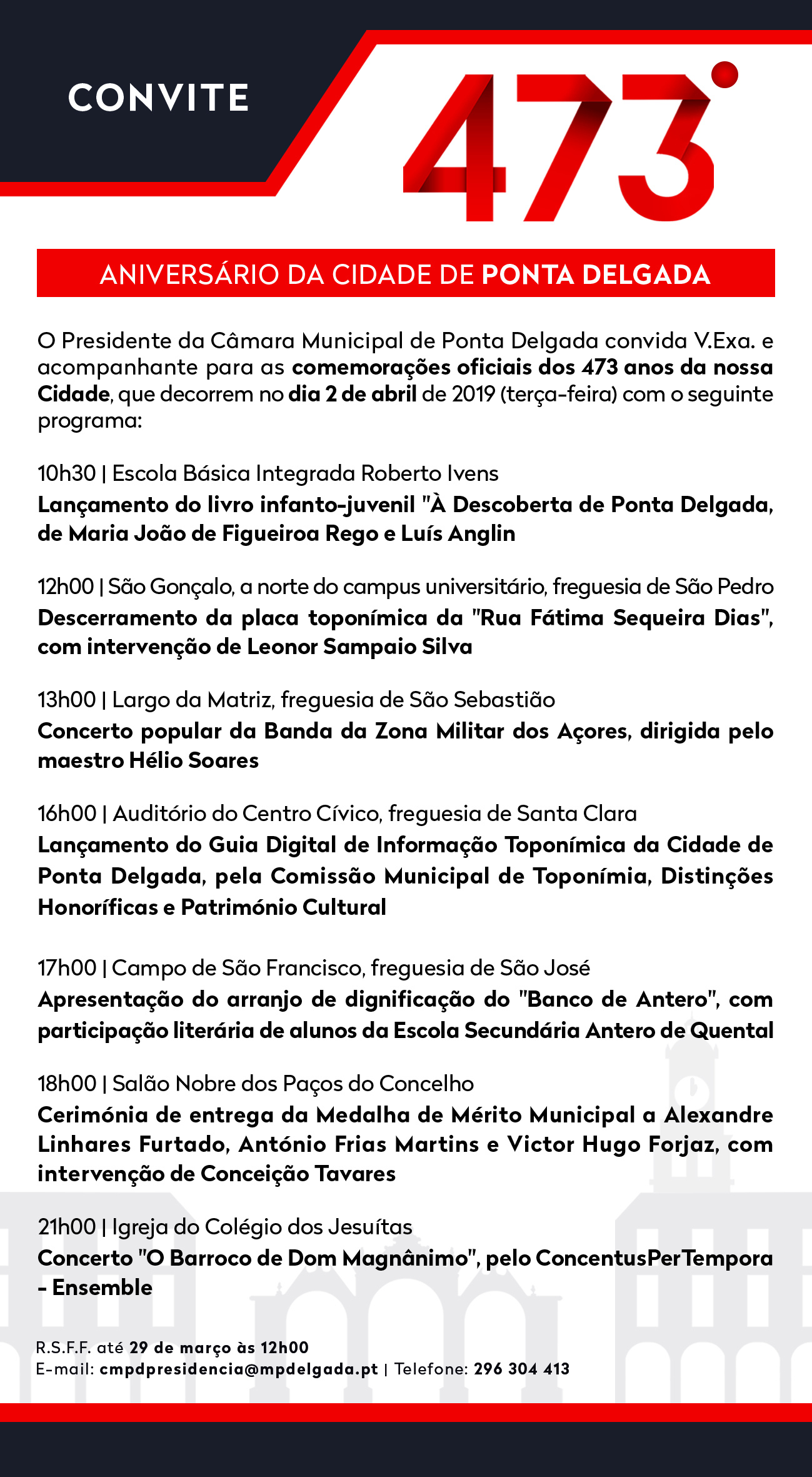 18:00 – Cerimónia comemorativa do 473º aniversário da Cidade de Ponta Delgada, com entrega de medalha de mérito municipal a Alexandre Linhares Furtado, António Frias Martins e Victor Hugo Forjaz | Salão Nobre