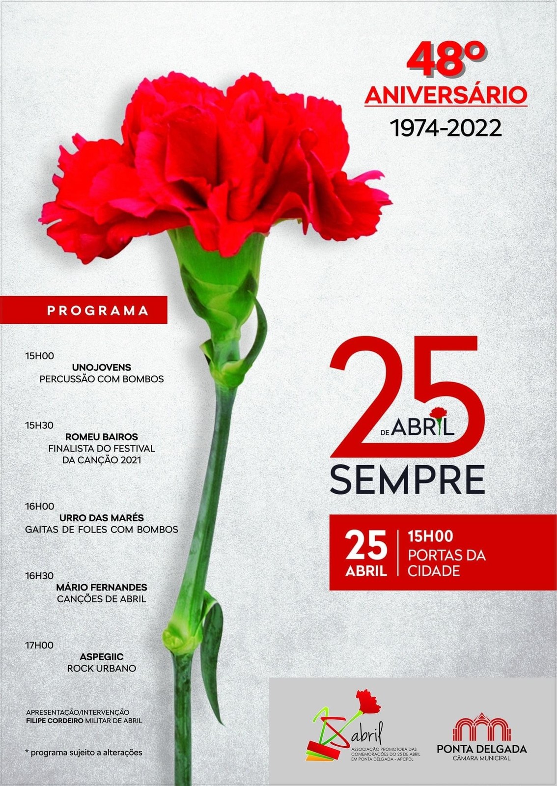 A Câmara Municipal de Ponta Delgada comemora os 48 anos da revolução dos cravos com concertos nas Portas da Cidade e com a intervenção de Filipe Cordeiro, militar de Abril.