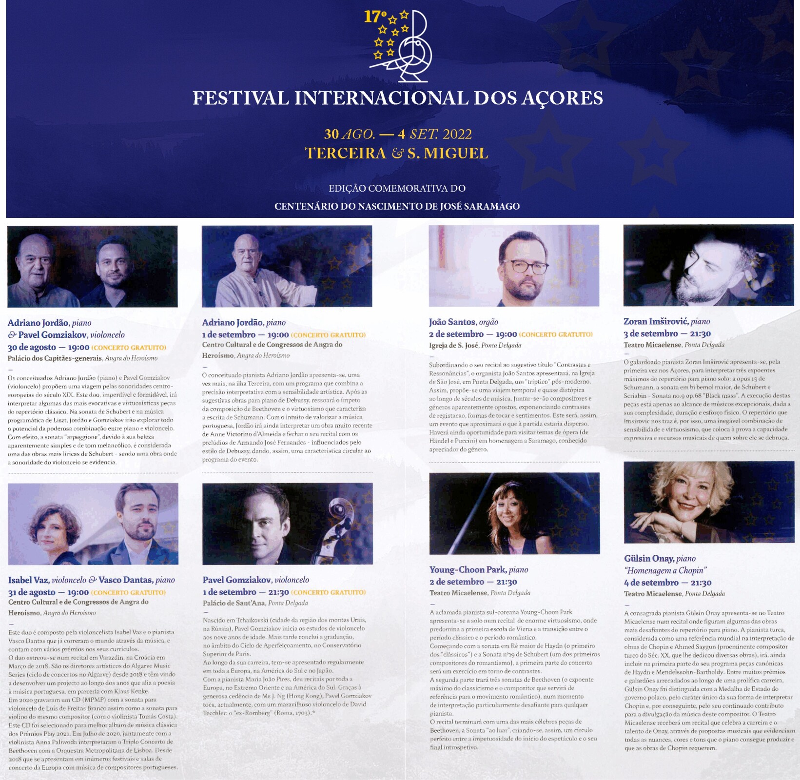 A 17ª edição do Festival Internacional dos Açores realizar-se-á de 30 de agosto a 4 de setembro de 2022, numa fase do verão em que se sente o prenúncio do outono. Esta edição de 2022 pretende comemorar os cem anos do nascimento do escritor José Saramago, para quem a música foi uma paixão, quase em pé de igualdade com a literatura. O violoncelo era um dos instrumentos de eleição para Saramago, como ressuma claramente de sua obra As Intermitências da Morte. Neste seu romance, o violoncelista consegue a proeza de seduzir e de humanizar a morte através da sua. Perante a morte transformada numa mulher, também o violoncelista, «rodeado de livros, de cadernos de música, de partituras», se transforma no «próprio Johann Sebastian Bach compondo em cöthen o que mais tarde seria chamado o opus mil e doze».
