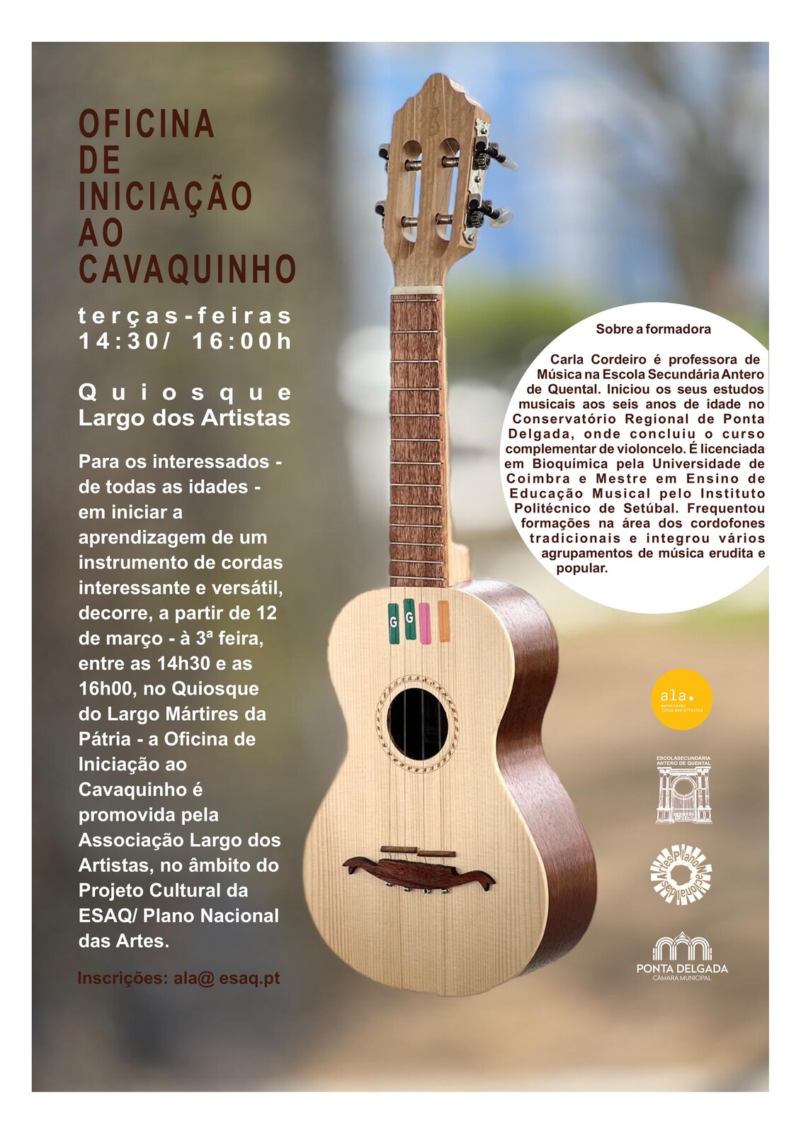 Esta oficina dirige-se a todos os que queiram iniciar a aprendizagem de um instrumento de cordas interessante e versátil, decorre, a partir de 12 de março - à 3ª feira, entre as 14h30 e as 16h00, no Quiosque do Largo Mártires da Pátria - a Oficina de Iniciação ao Cavaquinho é promovida pela Associação Largo dos Artistas, no âmbito do Projeto Cultural da ESAQ/ Plano Nacional das Artes.
