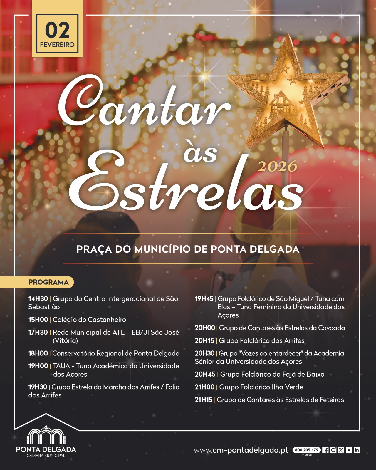 Na próxima segunda-feira, dia 2 de fevereiro, 13 grupos musicais informais, compostos por cerca de 500 pessoas oriundas de várias freguesias do concelho, vão deslocar-se à Praça do Município e à Câmara Municipal de Ponta Delgada para celebrar e dar continuidade à tradição secular do “Cantar às Estrelas”.
