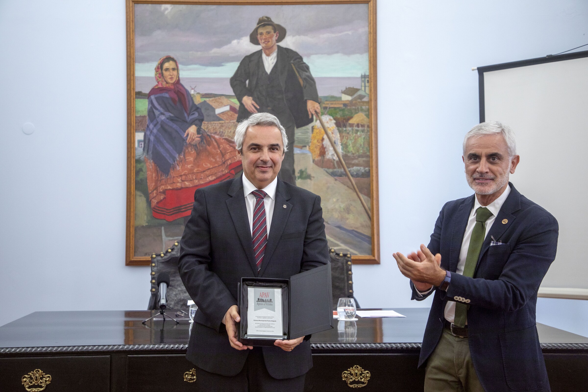 O Presidente da Associação Portuguesa de Apoio à Vítima, João Lázaro, entregou uma distinção ao Presidente da Câmara Municipal de Ponta Delgada, Pedro Nascimento Cabral, como reconhecimento da importante parceria com a APAV e pelo exemplo dado na luta pelos direitos das vítimas de crime.