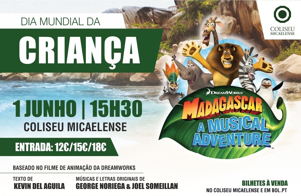 Os bilhetes para o espetáculo infantil “Madagáscar - Uma Aventura Musical” já estão à venda no Coliseu Micaelense ou através da www.bol.pt. O espetáculo terá lugar a 1 de junho, às 15h30, no Coliseu Micaelense, e terá a duração de setenta minutos.