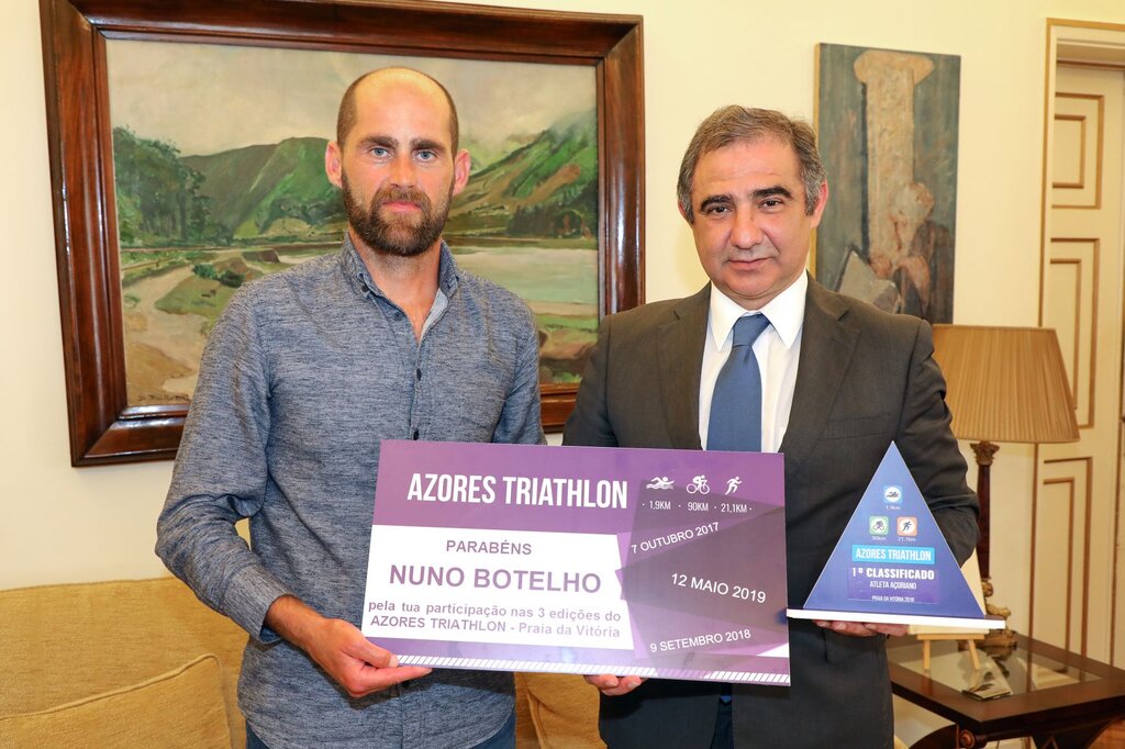 O Presidente da Câmara Municipal de Ponta Delgada, José Manuel Bolieiro, recebeu e felicitou, esta tarde, o atleta de Ponta Delgada Nuno Botelho, o Melhor Açoriano no III Azores Triathlon realizado domingo na Praia da Vitória.