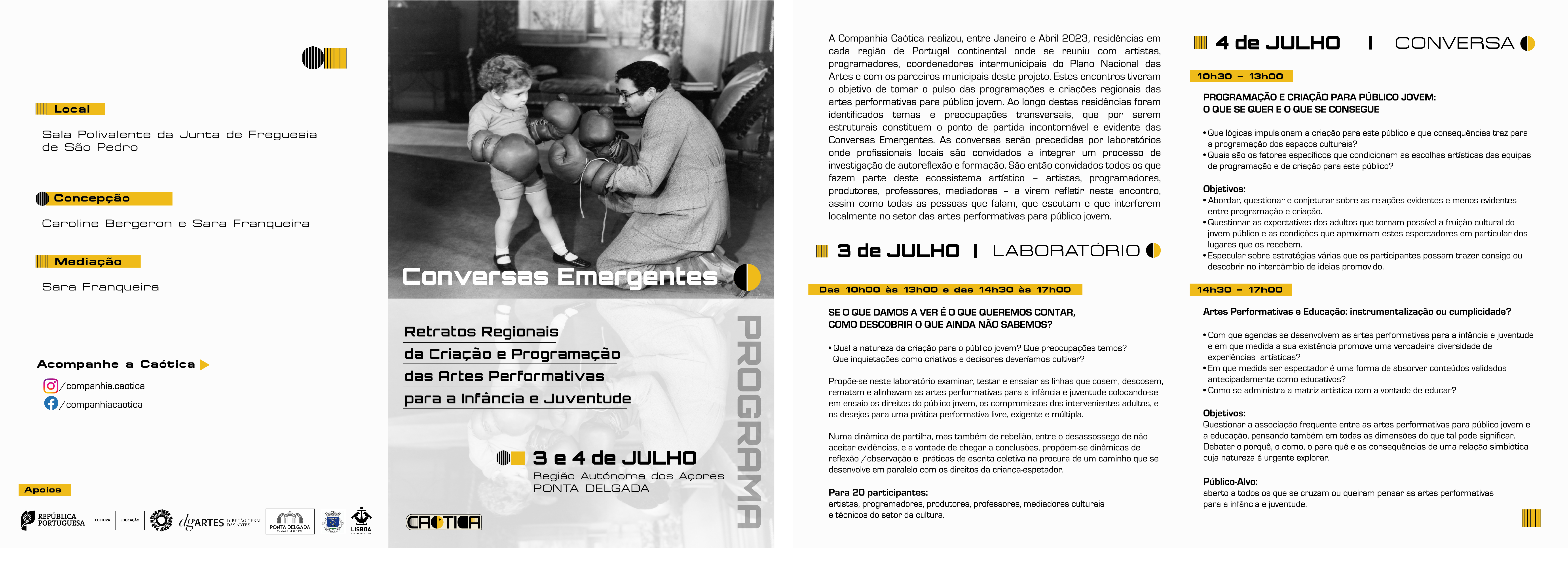 Uma iniciativa que consiste em conversas emergentes, “dirigidas para artistas, programadores, produtores, professores, mediadores culturais e técnicos do setor da cultura, que são convidados a refletirem neste encontro, assim como todas as pessoas que falam, que escutam e que interferem localmente no setor das artes performativas para público jovem”.