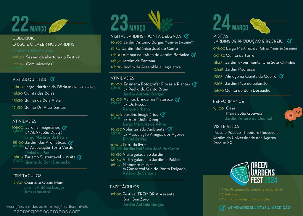 De 22 a 24 de março, a Câmara Municipal de Ponta Delgada, em parceria com o CHAM- Centro de Humanidades, da Universidade dos Açores, vai realizar a 1ª edição do Green Gardens Fest, um festival de caráter cultural e recreativo que tem como principal objetivo dar a conhecer os jardins, quintas e parques do concelho.
