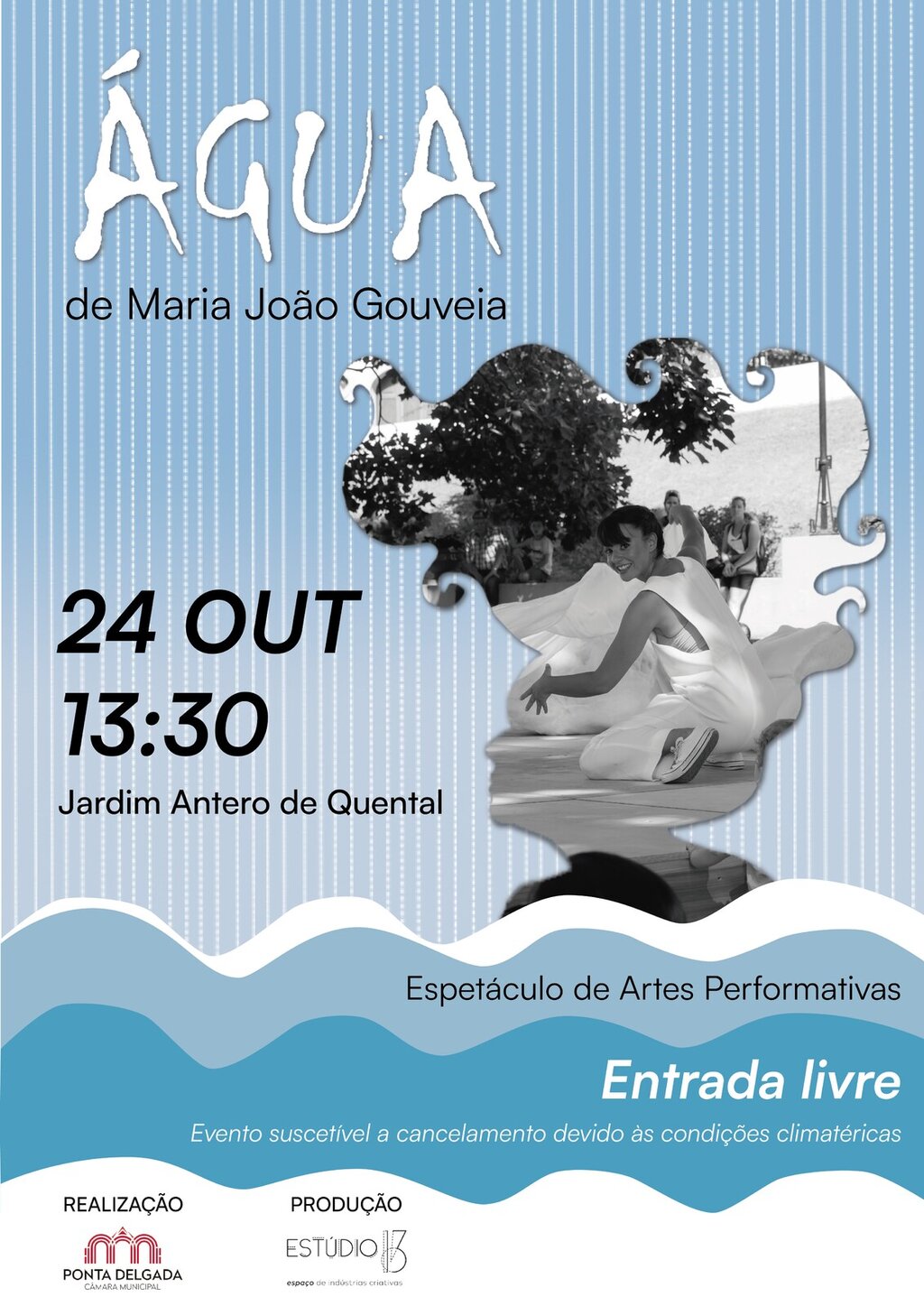A Câmara Municipal de Ponta Delgada e o Estúdio 13 apresentam, no Jardim Antero de Quental, no próximo dia 24 de outubro, pelas 13h30, o espetáculo de dança “Água”.