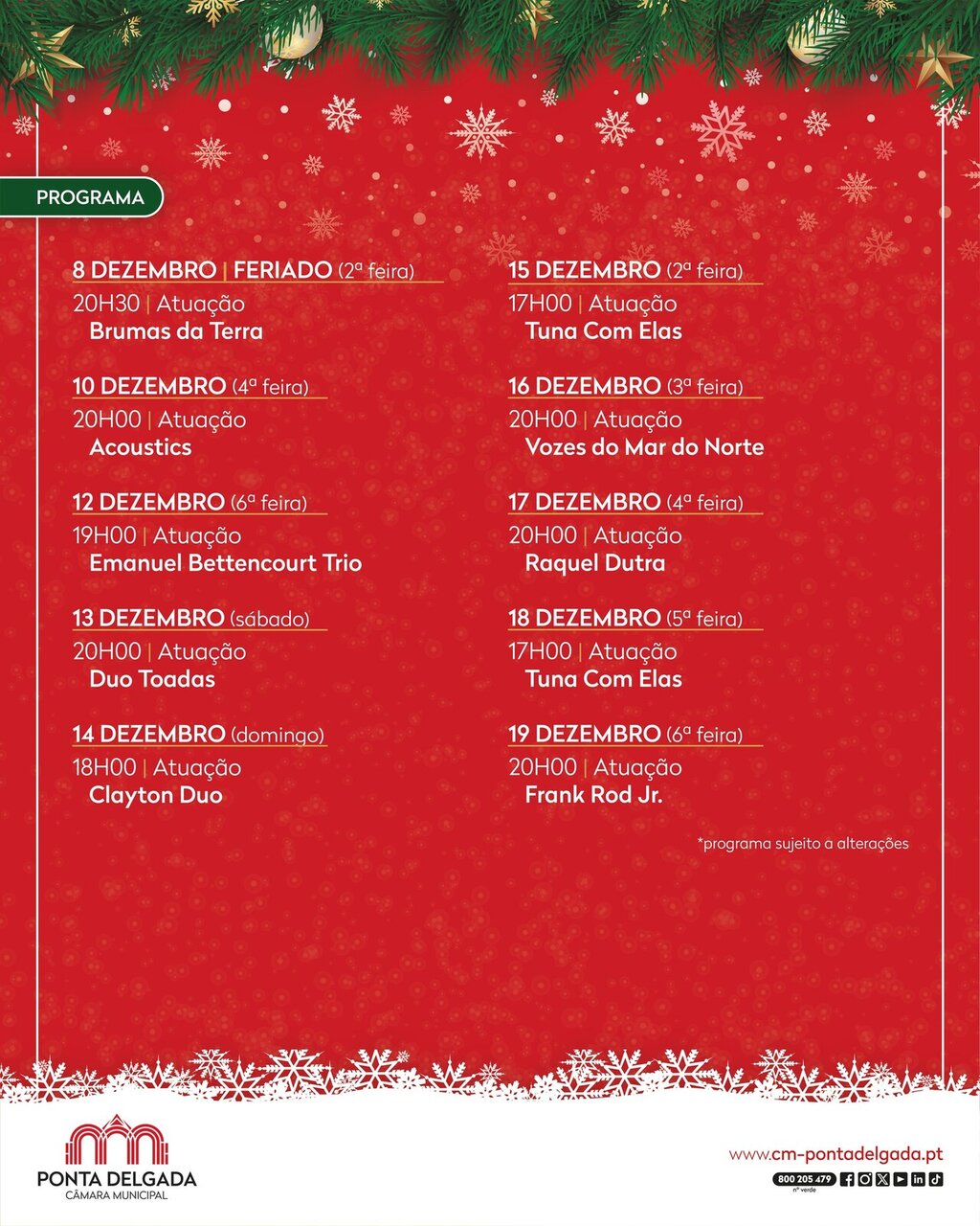 Assim, de 8 a 14 de dezembro, Ponta Delgada contará com as atuações dos Not’ ao Lado, dos Tunídeos – Tuna Masculina da Universidade dos Açores, Associação Tradições, Back To The Funk, Fandangafarra e da Filarmónica Lira de São Roque.