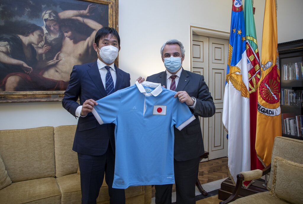 Os altos representantes do futebol japonês – Representante da Federação Japonesa de Futebol na Europa, selecionador e adjunto do selecionador - deslocaram-se aos Paços do Concelho para a apresentação de cumprimentos ao edil, que se fez acompanhar no encontro pelo Vice-Presidente da Autarquia, Pedro Furtado.