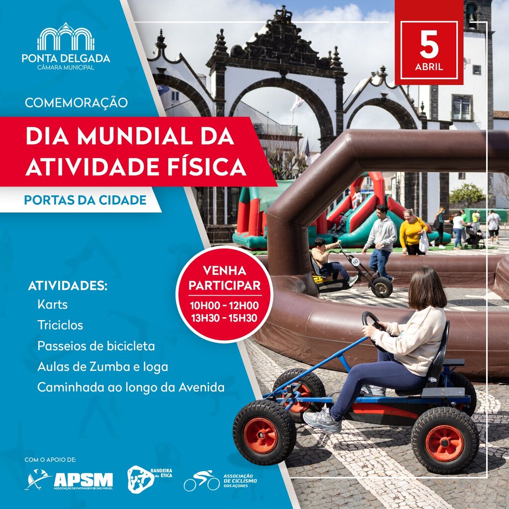 Ponta Delgada vai comemorar o Dia Mundial da Atividade Física, amanhã, dia 5 de abril, das 10h00 às 12h00 e das 13h30 às 15h30, enchendo o coração da cidade com iniciativas que vão meter a população a mexer por um estilo de vida mais saudável.