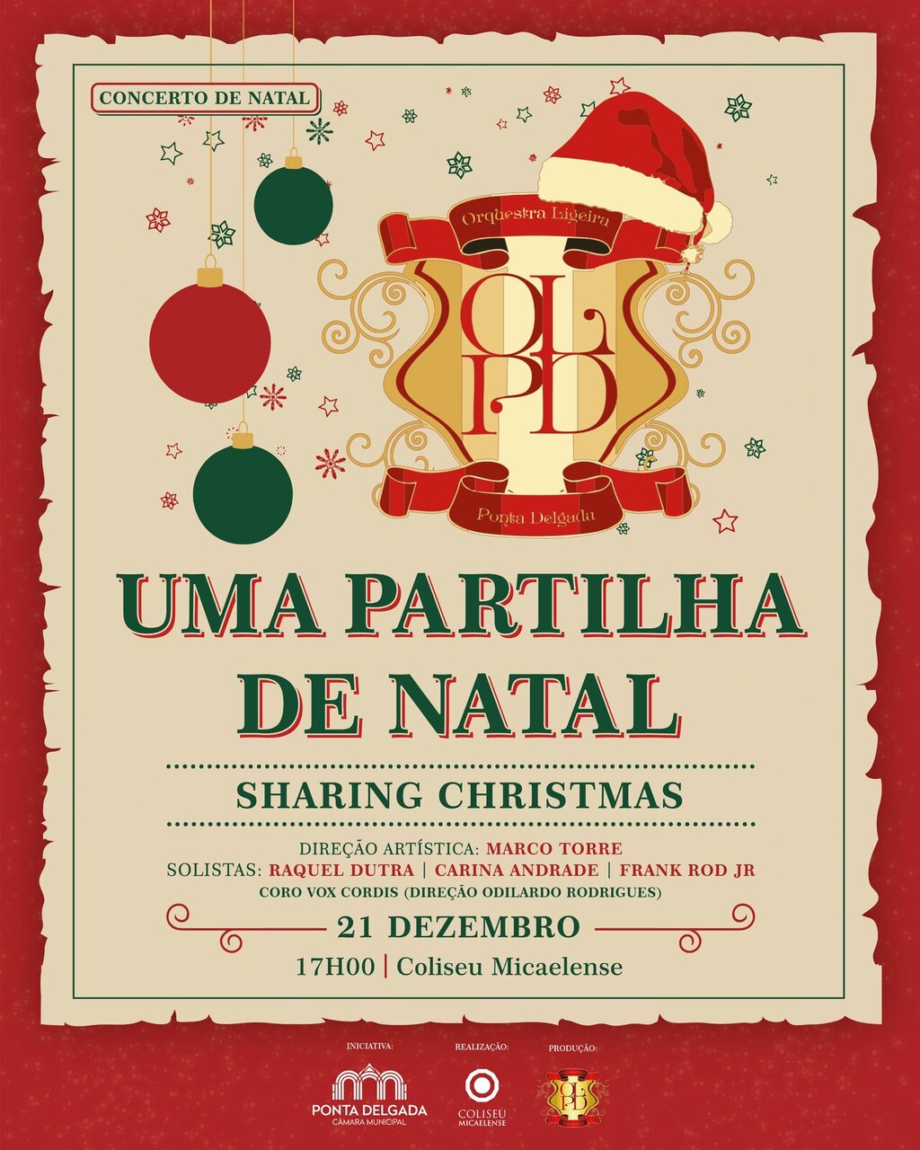 No âmbito do Programa de Natal da Câmara Municipal de Ponta Delgada para 2025, o Coliseu Micaelense irá acolher, a 21 de dezembro, pelas 17h00, o concerto "Uma partilha de Natal", protagonizado pela Orquestra Ligeira de Ponta Delgada, sob a direção artística de Marco Torre.