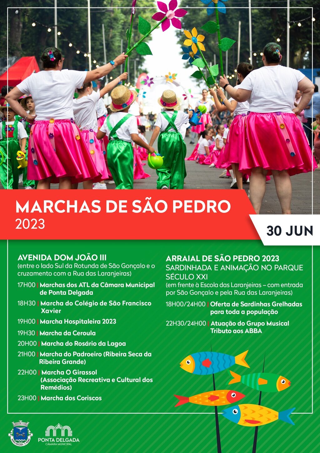 O evento começa às 17h00, com Marchas dos ATL da Câmara Municipal de Ponta Delgada, Marcha do Colégio de São Francisco Xavier, Marcha Hospitaleira 2023, Marcha da Ceroula, Marcha do Rosário da Lagoa, Marcha do Padroeiro (Ribeira Seca da Ribeira Grande), Marcha O Girassol (Associação Recreativa e Cultural dos Remédios), e Marcha dos Coriscos.